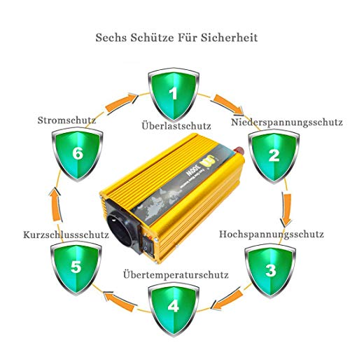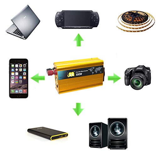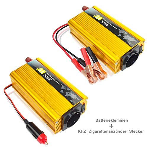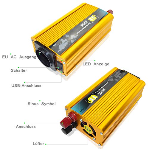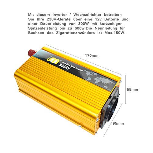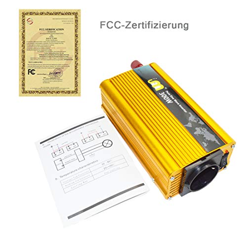 Specification: CIDEARY 300W Reiner Sinus Wechselrichter, 12V auf 230V KFZ Spannungswandler Power Inverter mit USB Anschlüsse Zigarettenanzünder Anschlüssen(Gold, 300W Reiner Sinus Wechselrichter)