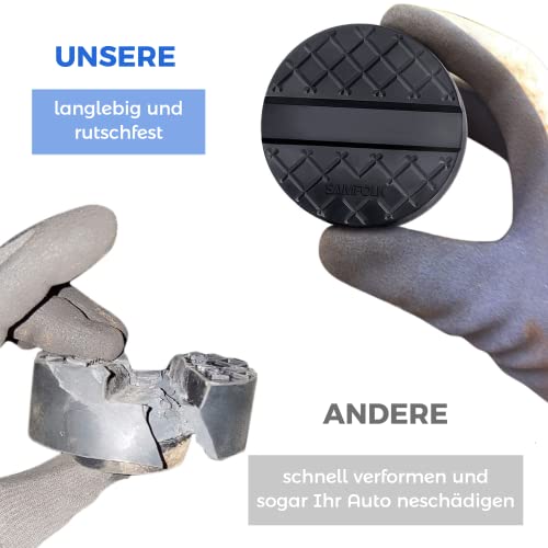 EINFACH & UNIVERSELL — Die Wagenheber Gummiauflage ist perfekt für die gängigsten Wagenheber und Hebebühnen verschiedener Körpertypen geeignet, lässt sich leicht und schnell am Wagenheber montieren und sitzt fest im Auflagenteller